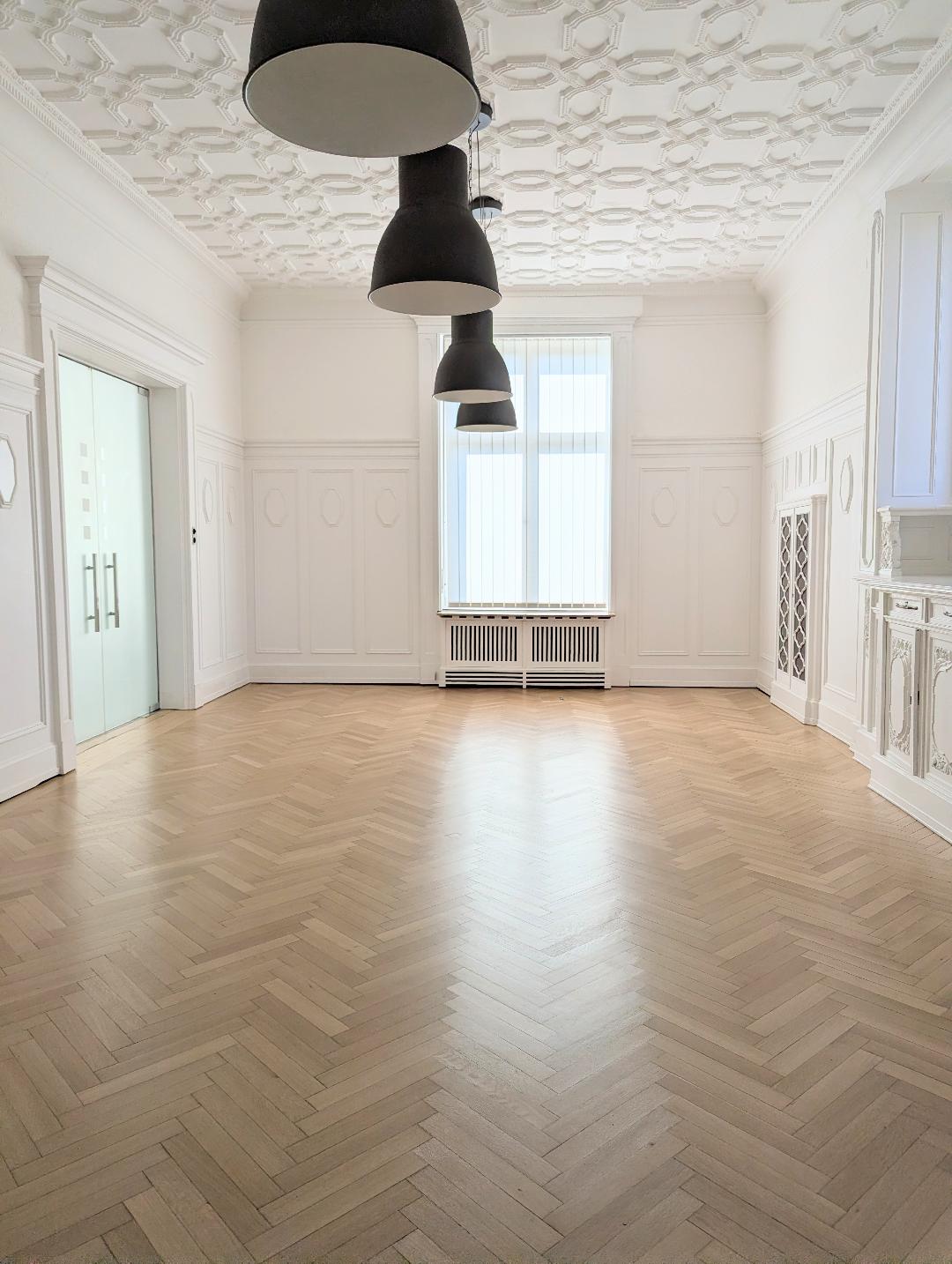 Hohe Decken, Stuckverzierungen, Holzverkleidungen, edle Parkettböden und helle Räume, moderne Ausstattung, große Fensterflächen mit traumhaften Flussblick, eine großzügige Terrasse und Gartenanlage am Wasser schaffen inspirierende Arbeitsplätze, die Kreativität, Motivation, Produktivität, Wohlbefinden und Zufriedenheit Ihrer Mitarbeiter fördern.