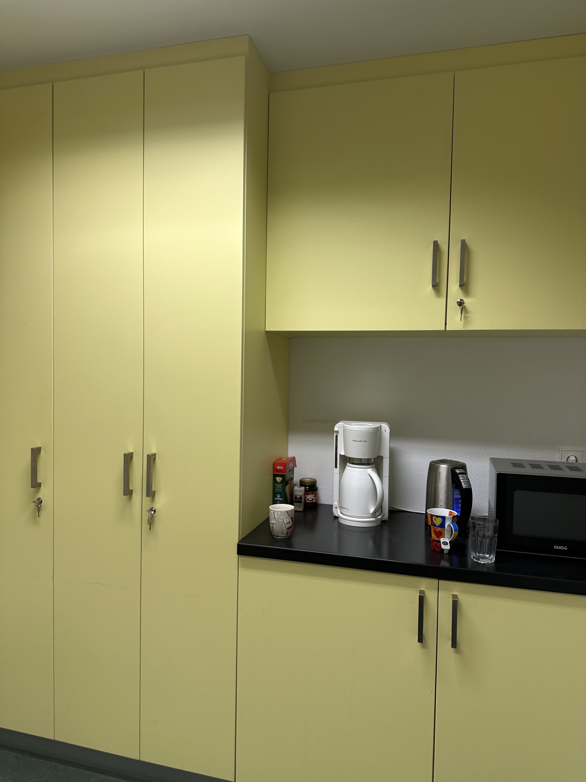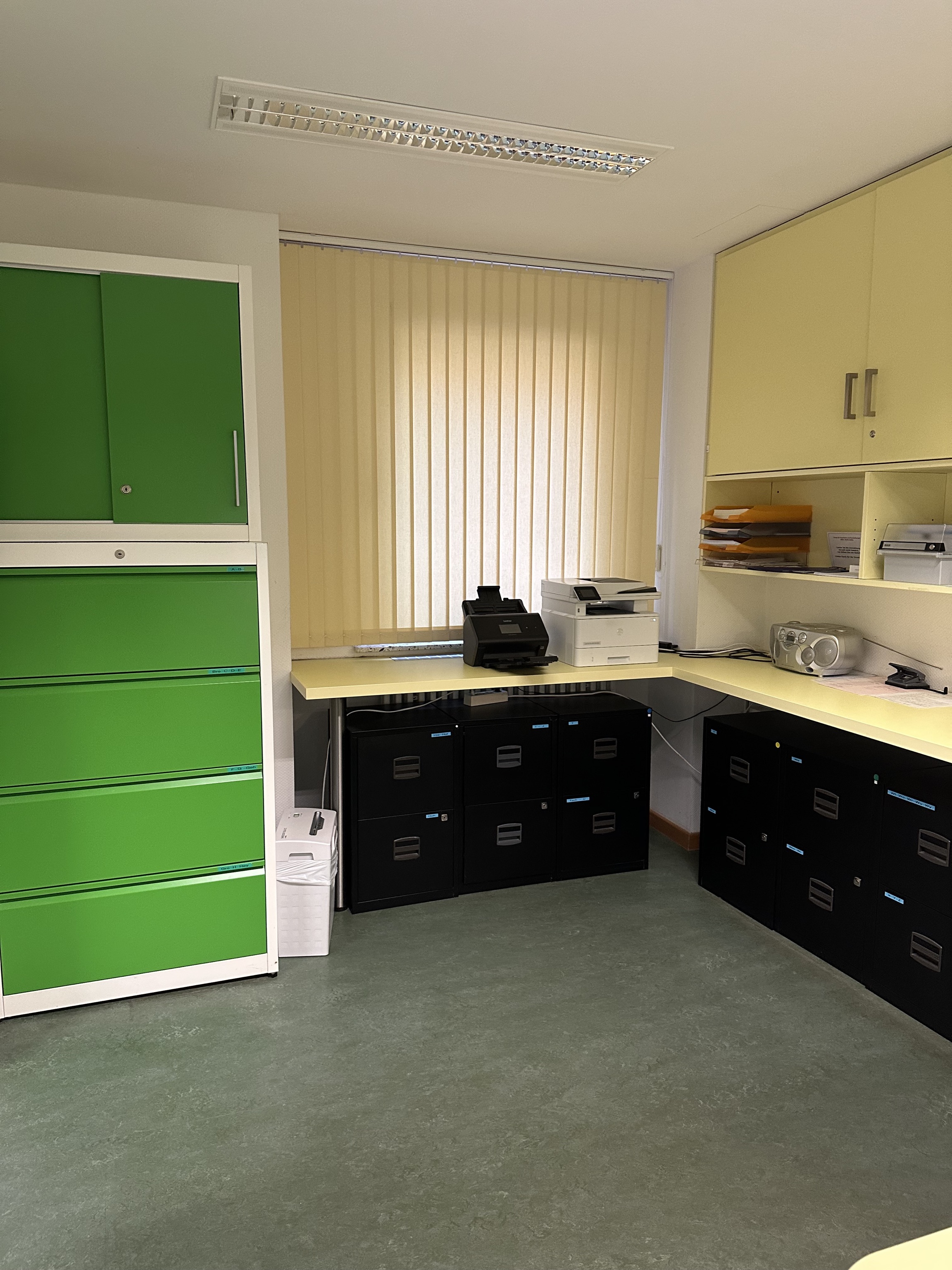 2 PC - 1 Empfang, 1 Sprechzimmer, Software EPIKUR, Kartenleser- Anmeldung und 1 Reserve, 1 Kopierer, 1 Scanner + Drucker, 1 Drucker, 2 x Festnetz, Aktenvernichter, Kühlschrank, Mikrowelle, Wasserkocher, Kaffeemaschine, Karteischränke
